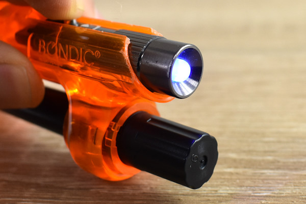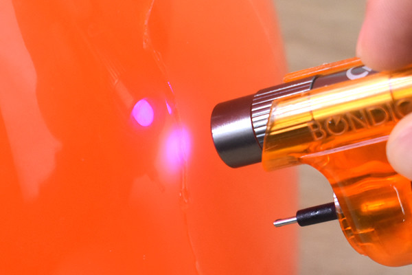 「BONDIC」が接着できる仕組みは、液体プラスチックと紫外線ライトに秘密が。黒いカートリッジに入っている液体プラスチックは、本体上部の紫外線ライトを4秒ほど照射すると硬化。破損したプラスチックやセラミック、ガラスなどを修復・修繕できます。