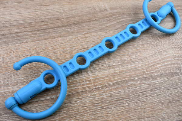 フックを伸ばした状態で大きさを測ったところ、全長は45cmほどで意外と長い印象。ハンガーを吊るす本体部分はポリプロピレン、フック部はガラス繊維入りポリプロピレンで作られています。力を入れて少し曲げてみたのですが、たしかにフック部の方が硬いようです。