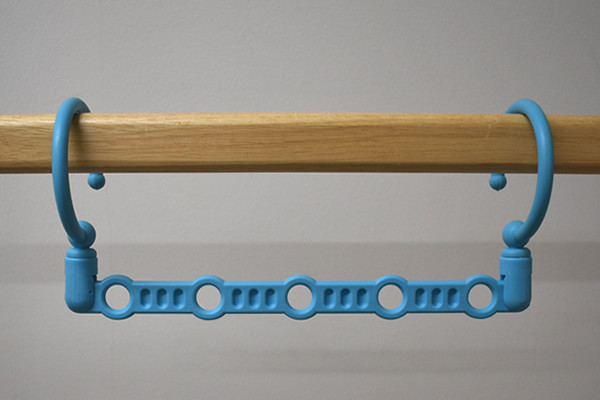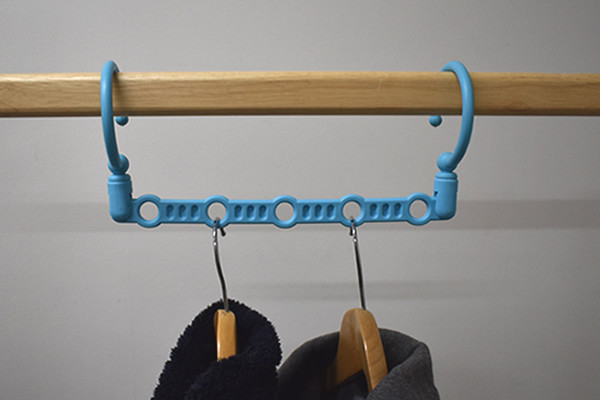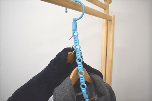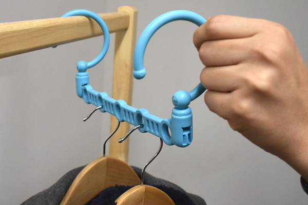本体には5つの穴が開いており、5枚分の服を1枚分のスペースに収納することができます。片方のフックをポールなどに吊るし、もう片方のフックを引っ張り上げれば取り出しもラクラク。スーツなどのセットアップやお気に入りのコーディネートを、ひとつの「ハンガー&ハンガー」にまとめておくと良いかも。ちなみに耐荷重は3kgまでとなっているので、ジャケットやコートをかける際は重量を気にしてくださいね。