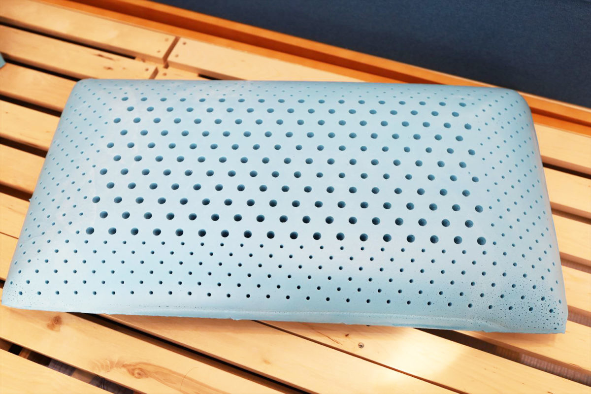 今回、マットレスと同時に昨年12月に新発売したコアラ・ピロー(実売価格1万2500円)も試してみました。コアラピローも2層構造となっています。中央部は大きな通気孔を穿った柔らかめの素材で頭部を優しく包み込み、外縁部は小さな穴が密集した硬めの素材で首をしっかりと支えます。一面にびっしり穿った大小の通気孔と、使用しているゲル入り低反発素材により、頭部・首元にこもりがちな体温を適度に逃してくれます。