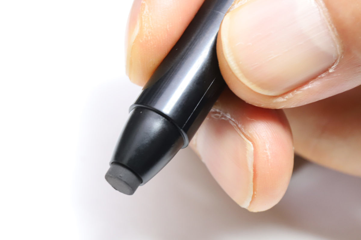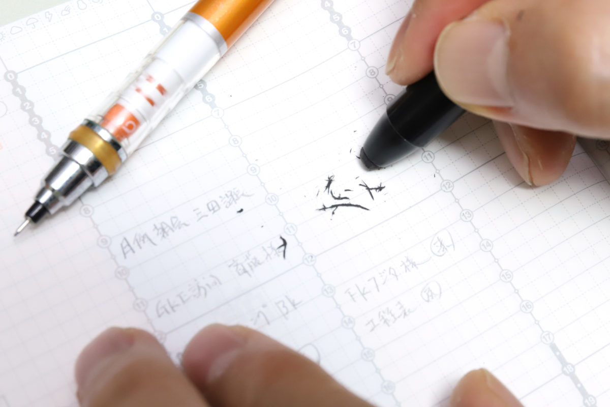 後端のノックボタンを押すと、カチッというクリック感とともに、数㎜ずつ先端から棒状の消しゴムが出てくる構造。ちなみにメーカー推奨は2ノック。消しゴム生地は硬めに仕上げられているものの、無駄に軸から出すと、消している最中にポキリと折れてしまいそうなので、ここは指示通り2ノック分で消すのが正解だろう。