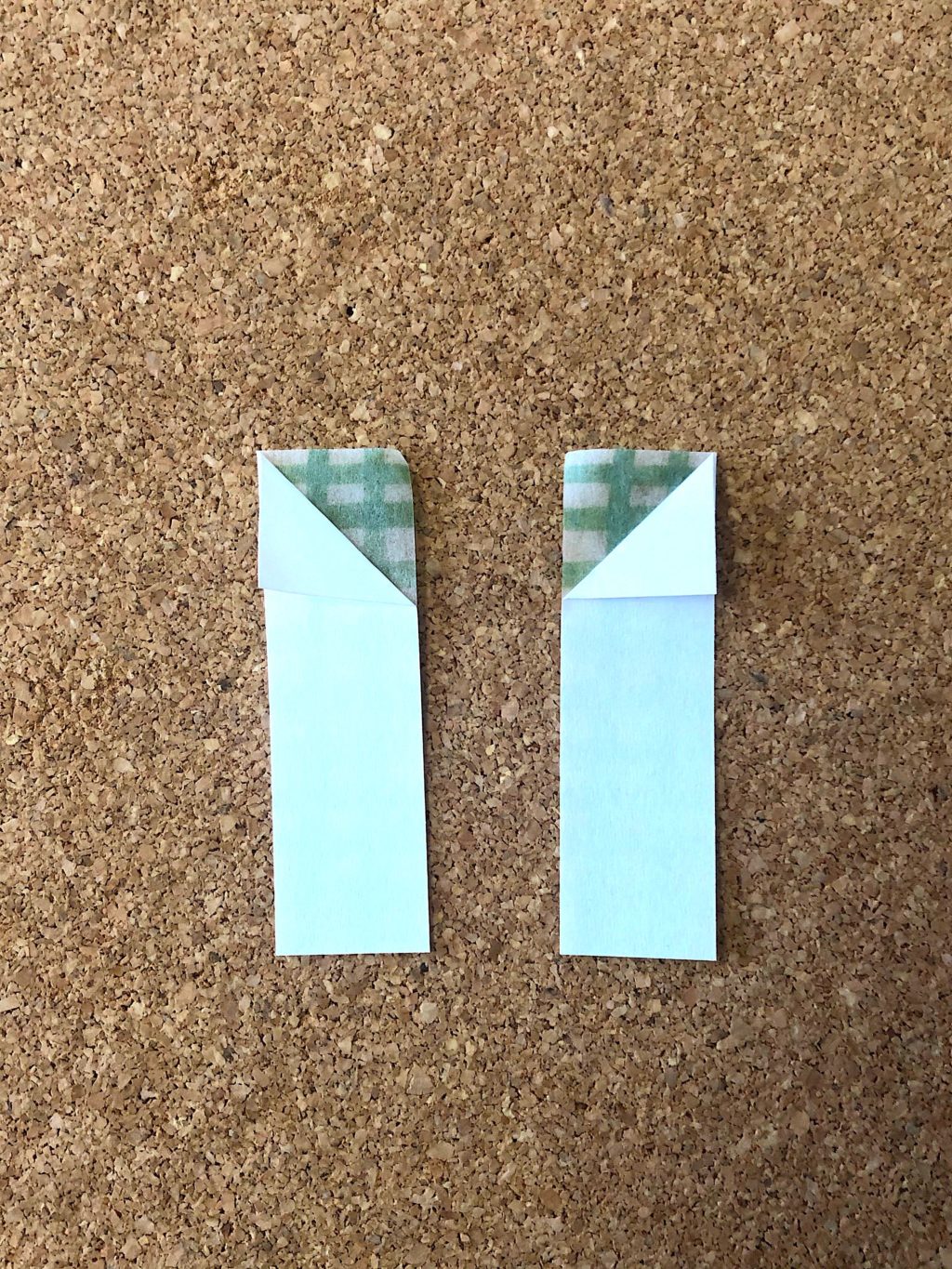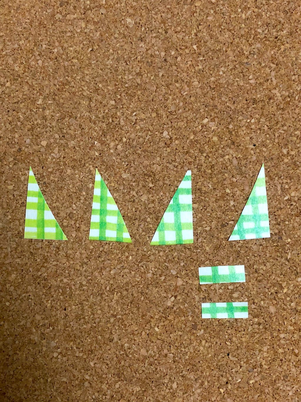 まずはデコレーションに使うマスキングテープを4枚選び、そのうち1枚を切って小さな長方形を作ります。もう1枚は横半分に折り、斜めに切って直角三角形4つを作りましょう。