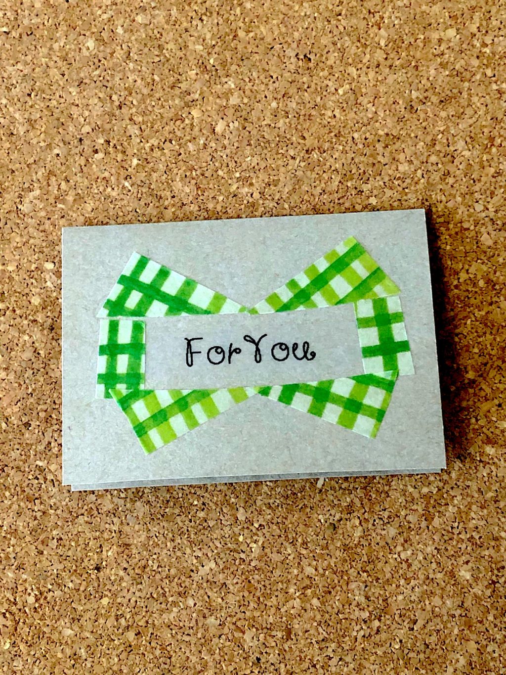 続いて、メッセージカードに長方形2つと直角三角形4つを貼り付けてリボンの形を作ります。テープはきれいに剥がれるので、ちょっと失敗してもやり直せるから大丈夫。