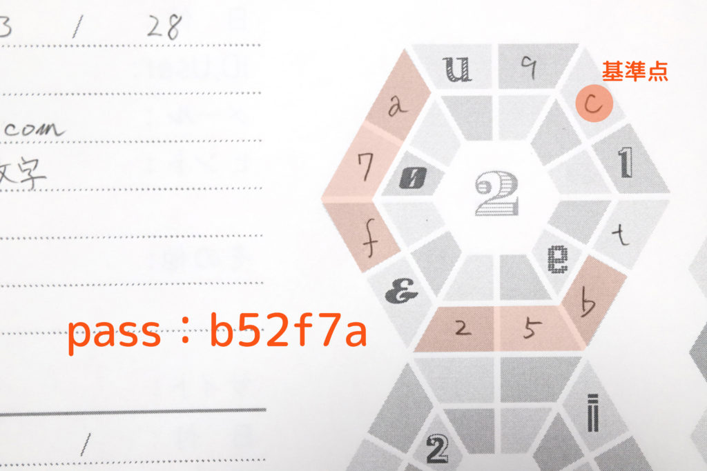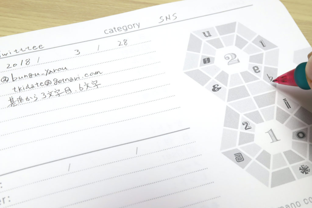 紙面にはまず、サイト名・ID記入欄があり、その下になにやらイラストアイコンが6つ並んでいる。このアイコンが、ノートのキモとなるパスワード生成イメージだ。