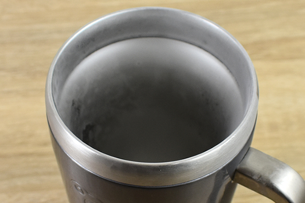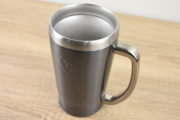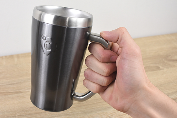 魔法瓶などでよくみられる「真空断熱構造」を採用した同商品。真空層の他に保冷剤が入った層をプラスしてあるため、ジョッキに注いだ飲み物をさらに冷やすことが可能です。ジョッキの容量は420mlとたっぷりサイズ。約592gほどの重さがあり、空の状態でもなかなかの重量を感じました。