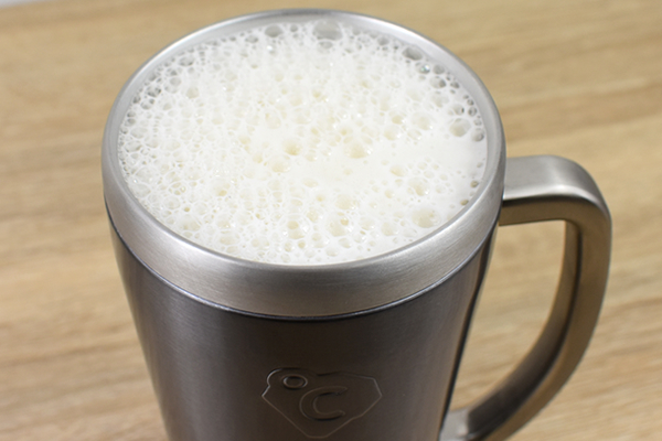 せっかくなのでビールを注ぎ、どれほど冷えるかをチェック。公式サイトによると、飲み物を入れてからおよそ1分ほどで氷点下まで温度が下がるそうです。実際にビールをジョッキへ注いでしばらく待ってみたところ、一部がシャーベット状になるほど冷やされていました。