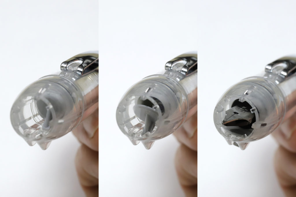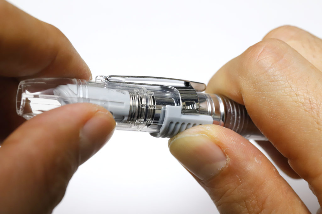 ケアに関しては、ノック式万年筆で気になるのが気密性の部分だ。プラチナ万年筆の製品は、キャップに「スリップシール機構」という気密性を高める工夫があり、1年以上放置してもインクが乾かないことで知られている。だが、ノック式ではもちろんスリップシール機構は使えない。