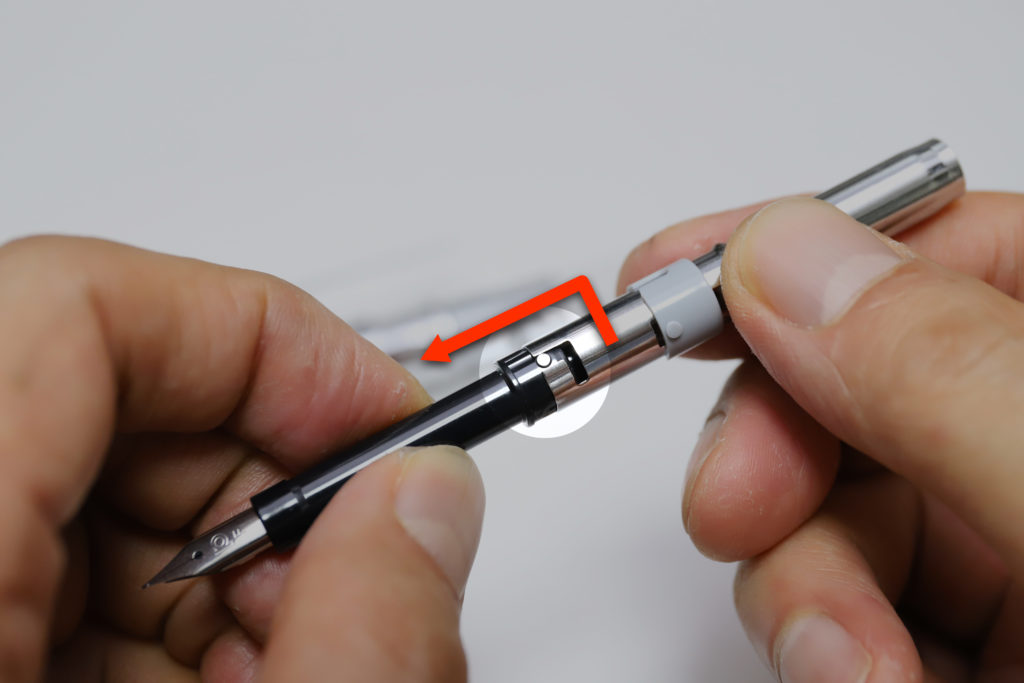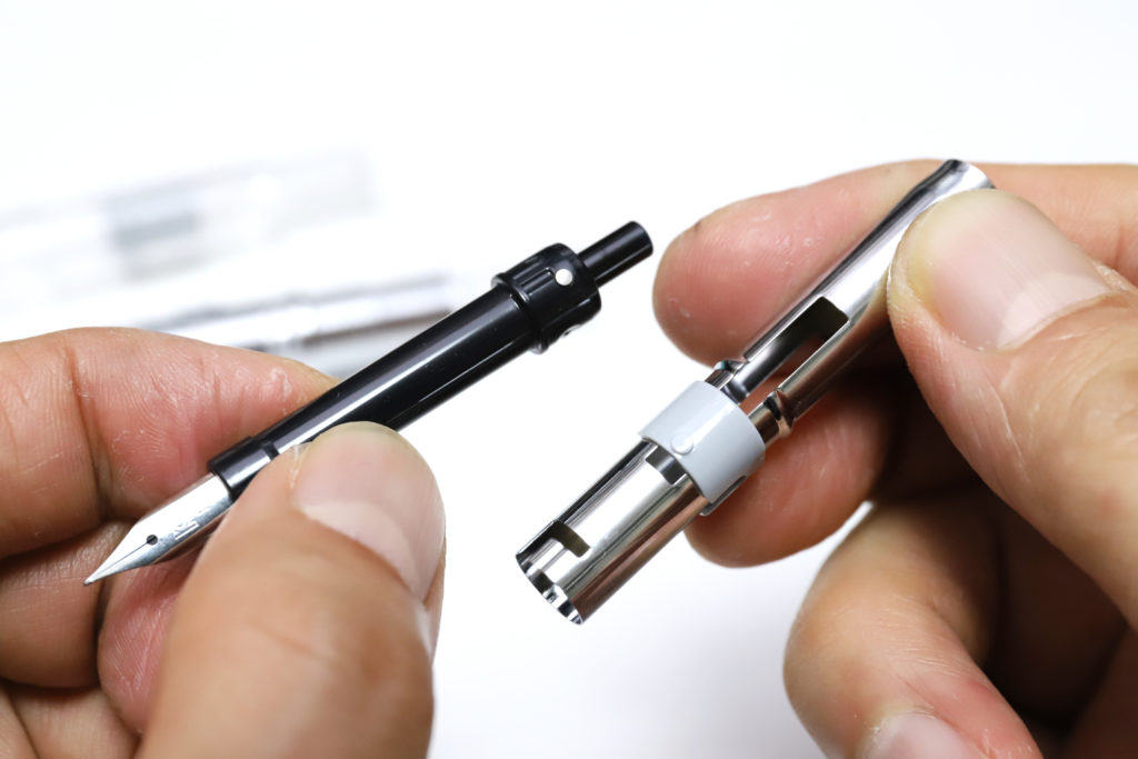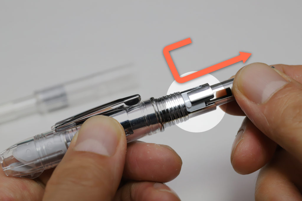 最後に、ユニット中央のL字溝に沿ってねじってやると、これでようやくノック部とペン先が分離して、インクカートリッジやコンバーターの取り外し・インク補充ができる、という手順である。