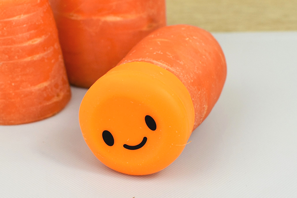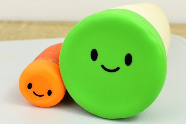 同商品は大根やかぶなどの太い野菜に対応する“ダイちゃん”と、にんじんやズッキーニといった細長い野菜を守る“キャロちゃん”の2つ入り。カバーの表面に“目”と“口”がプリントされているおかげで、見た目はかなりキュートです。にっこりとした笑顔を見ていると、愛着が湧いてくるから不思議。