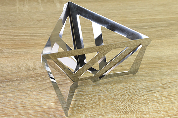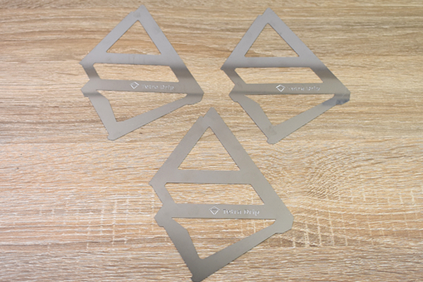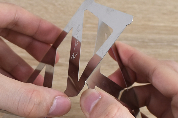 同商品は3枚のステンレス板で、大きさは約9(縦)×13cm(横)とポケットに入るコンパクトサイズ。板は台形に近いフォルムですが、ところどころ出っ張ったり欠けたりと複雑な形になっています。三角や四角にくり抜かれた部分もあり、なんとも近未来的なデザイン。