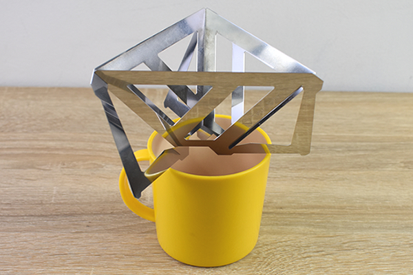 それでは実際にドリッパーとしての使用感を試すため、板を組み立てていきます。フック状になっている板の出っ張りを、ボディのくり抜かれた部分へひっかけて板を固定。枠は小さめの作りなので、差し込む時は少しだけたわませるのがポイントですよ。3枚の板ががっちりと噛み合うと、立派な三角錐型のドリッパーが完成しました。