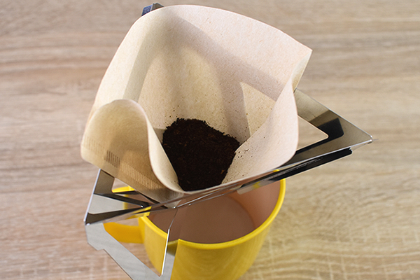 続いて実際にマグカップの上に設置して、コーヒードリップに使ってみます。3点で支えられたドリッパーは安定感抜群。ペーパーフィルターのコーヒー粉にお湯を注いでも、ズレたりガタつくことはありませんでした。これなら不安定な野外でも、安心してドリップコーヒーを楽しめそうですね。