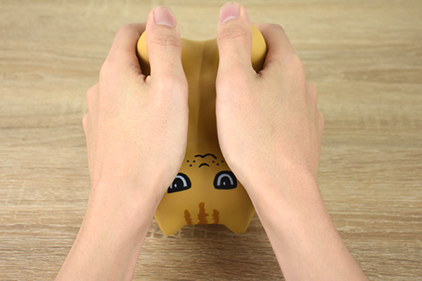 両手で握ってみたところかなりフィット感があり、ツボにググっと手足が入り込んできた時の気持ちよさがたまりません。この時に、こりもむにゃんを逆さまに持つのがポイント。親指の母指球にあてるようにして握ると効果的ですよ。