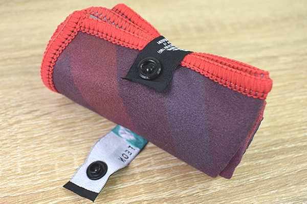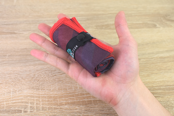 端についているストラップを使ってコンパクトにまとめると、タオルは4.5×11cmほどのサイズに。手の平にすっぽりと収まる程度の大きさです。鞄のすきまなどに入れやすいので、徐々に気温が上がってくるこれからの季節にぴったり。