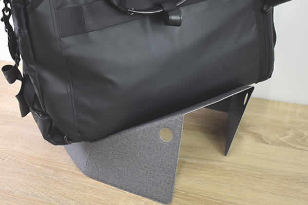 試しにカバンを乗せて耐久度をチェックしてみました。中身にタブレットや書籍といった複数のアイテムを入れてみたのですが、スタンドの形が崩れる気配はナシ。カバンを置くスペースが“谷型”になっているおかげで、バランスよくセットできるのも高評価ですね。