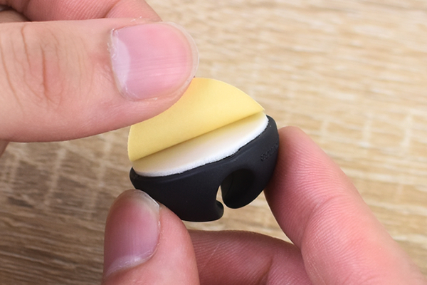 ホルダーをひっくり返してみると、底面には両面テープが。あらかじめ決めたポジションにホルダーを貼りつけておけば、線の通り道を固定できます。上部は完全に閉じているわけではないので、ホルダーを設置した後にケーブルを通すことも可能。試しにちょっと太めの充電ケーブルでチャレンジしたところ、少しの力で押し込むことができました。