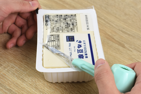 使い方はクリップの部分にフィルムを挟み、後はクルクルと回転させるだけ。冷蔵庫に入っていた豆腐で実証してみたところ、フィルムをツルっと巻き取れました。同商品を使用すれば、剥がしている途中でフィルムが破けることもありません。