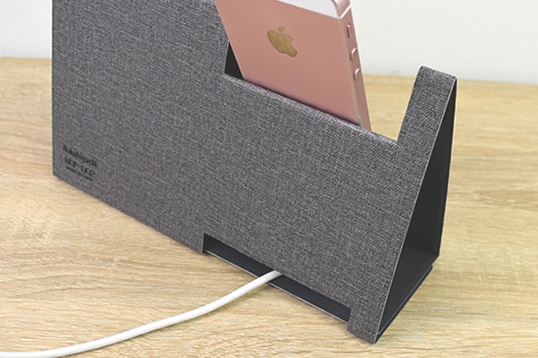 スマホ立て部分は充電器のコードを通せる仕様なのも高ポイント。ただしスマホは約84(幅)×10mm(厚さ)までのもの(ケースを含む)しか置けないので、購入の際はあらかじめ自分のスマホサイズと照らし合わせておきましょう。