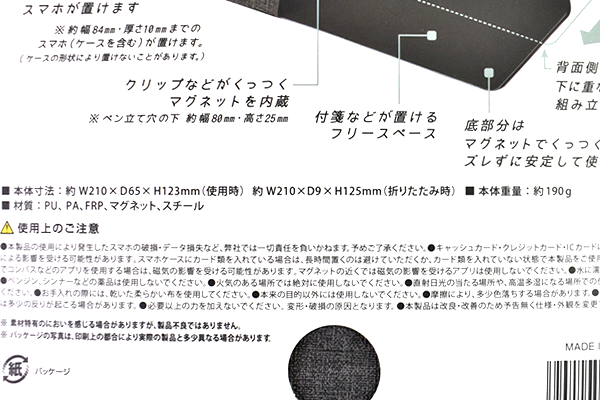 ペン立てとは思えない平たいパッケージを開けると、スマホと大差ない薄さの商品が登場。そのサイズは約210(幅)×9(奥行)×125mm(高さ)と驚くほどコンパクトです。これなら書類でぎゅうぎゅう詰めの鞄にも簡単に収納可能。重量も約190gと軽いので、持ち運びも苦になりません。