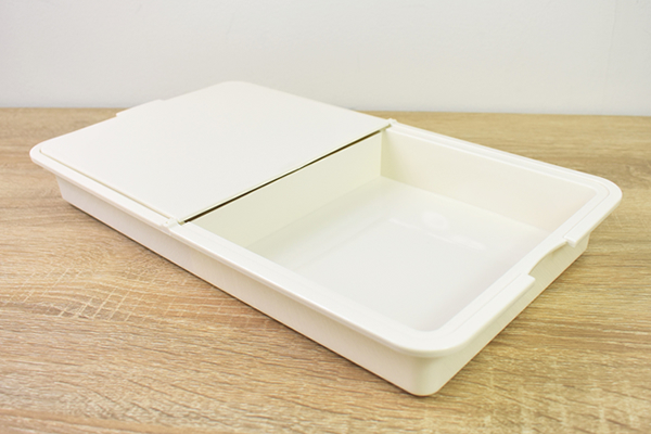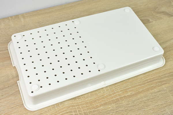 同商品の大きさは約35(幅)×20(奥行)×4.3cm(高さ)ほど。まな板としては少し小さい気がしますが、1人分の食材を切るだけなら問題ないサイズ感です。見た目は、白いトレーの上にまな板がのったような独特なデザイン。切った食材をそのままスライドさせれば、食材をトレーに移せる仕組みになっています。