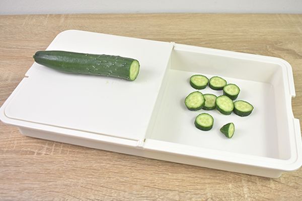 切り分けたきゅうりはすかさずトレーに投入。食材の移動がスムーズになるので、料理の時間を短縮することが可能です。ちなみにトレーの反対側が“ザル”のような作りをしており、そのまま食材を水洗いしてもOK。食材が散らかりにくくなる上、洗いものも減って片づけがラクチンでした。