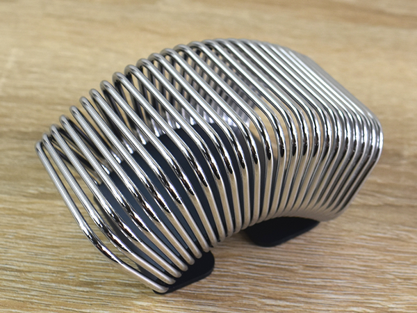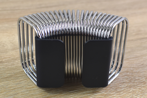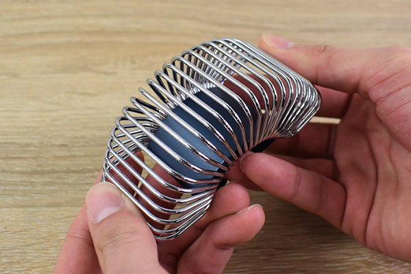 サイズは4.5(高さ)×8(奥行)×3cm(幅)とミニマルなサイズ感。置いておくだけで目を引くので、人を招待した時には注目を浴びるでしょう。クロムメッキやアルマイトなどで加工されたバネの光沢は、長く見ていても飽きさせません。見た目はかなり重厚そうですが、重さはわずか77gで持ち運びも楽々とできます。ちなみにハンドメイドのため、1つ1つの商品に色や質感の違いがあります。