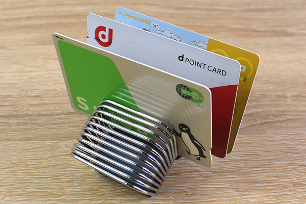 挟めるカードは約20枚程度ですが、バネの隙間にカードを差し込めばいいだけの使い勝手の良さもGOOD。まず試しにSuicaやポイントカードを挟んでみます。カードはバネにしっかりとフィットして安定感も抜群。カードを取り出す時は、引っ掛かることなくスムーズに引き抜けました。