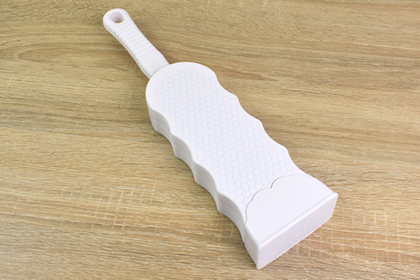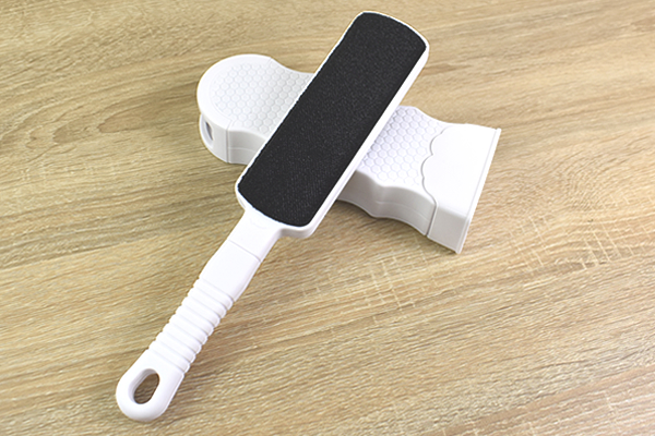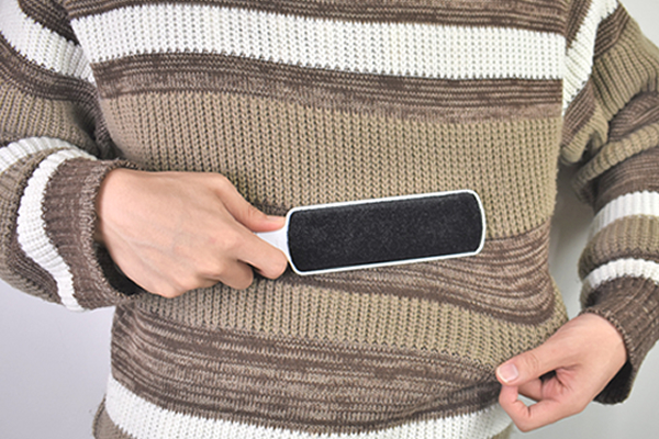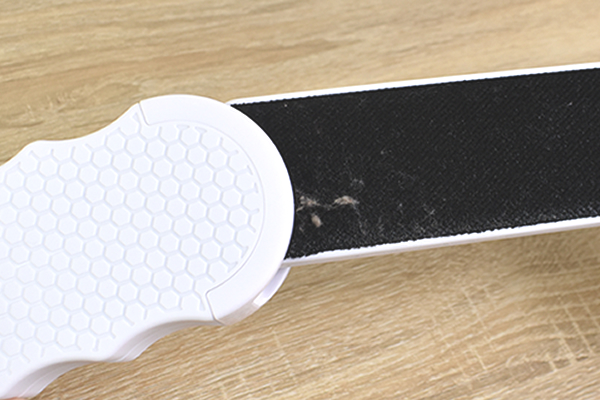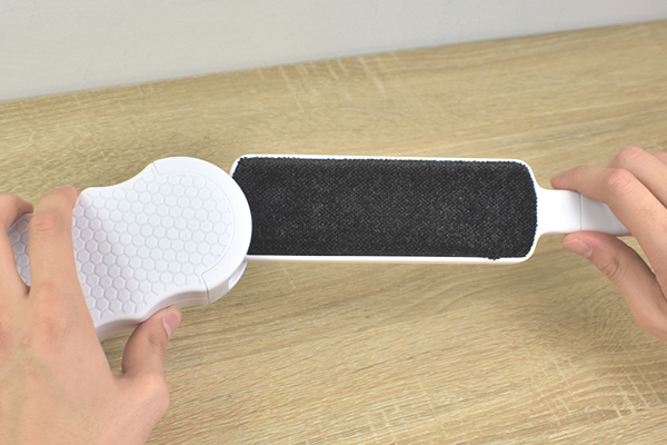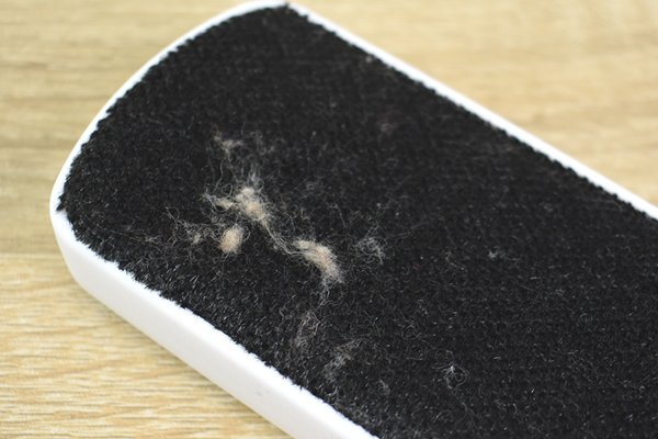 使い方は簡単で、ハンドル部に書いてある矢印の方向へブラシを動かすだけ。軽くブラッシングして表面を見てみると、ナイロン生地のブラシがホコリをしっかりキャッチしていました。思っていた以上にホコリや抜け毛が取れてクセになりそう。