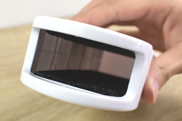 何度でもブラシが使えるようになる仕組みはケースの内側にありました。ケースの中を覗き込むと黒い生地が上下に。ここにブラシを差し込むとホコリが除去されます。