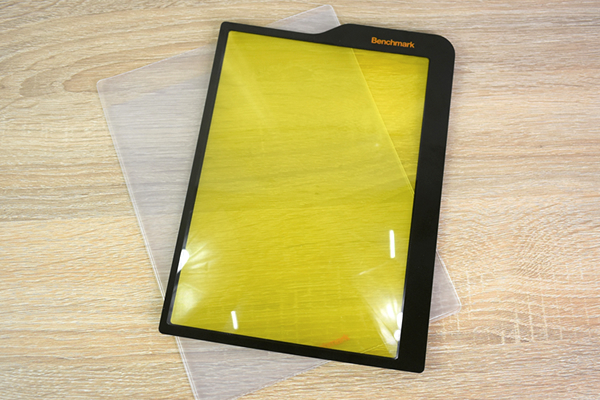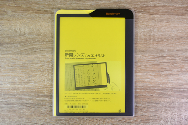 同商品のサイズは165(横)×230(縦)×0.4(厚さ)mm。黄色いレンズが黒い枠で覆われたシンプルなデザインをしています。“下敷き”にそっくりな見た目をしていますが、レンズを文字にかざすことで拡大鏡として使用。レンズの小さいルーペと比べて広範囲に文字を読めるので、新聞や雑誌などを読みやすいのがポイントです。