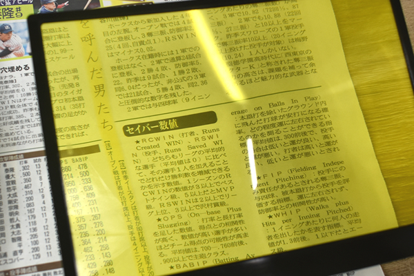試しにスポーツ新聞を使って文字の読みやすさを確認してみましょう。レンズを覗いてみると、文字の大きさがおよそ2倍くらいにまで拡大。文字のピントもピッタリと合っていて、小さく感じていた新聞の文字をスラスラと読み進めることができました。