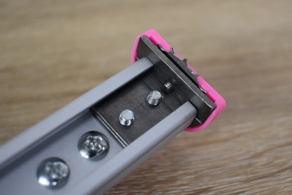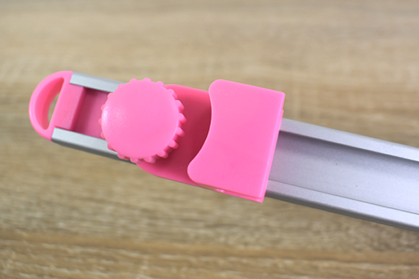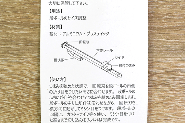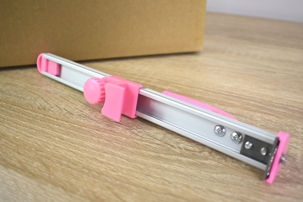 箱切り名人のサイズは約5.8(幅)×24.9(奥行)×3.1cm(高さ)、重さは100g程度。本体の“レール”はアルミニウムで作られており、端部に円形の回転刃がついています。回転刃といっても段ボールをカットするのではなく、折り目を作るためのパーツ。なお先端は鋭利になっているので、直接触らないようご注意を…。回転刃の他にも、ピンク色の「握り部」「締付つまみ」「ガイド」が搭載されていました。