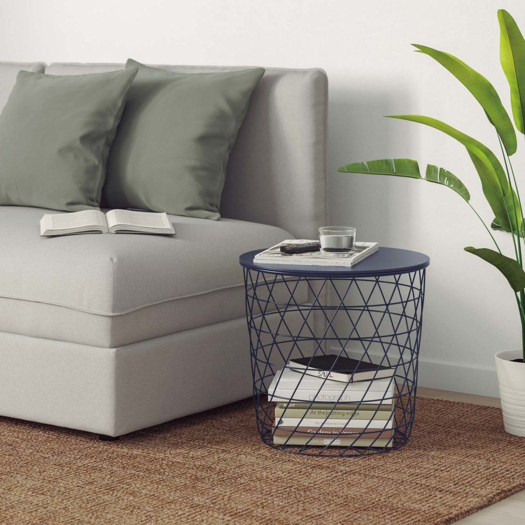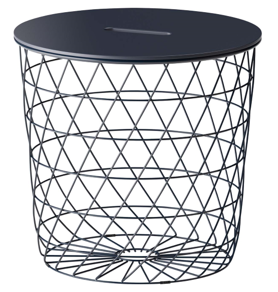 使い勝手の良い収納が付いた軽量なテーブル。テーブルトップは穴が空いており、指1本で簡単に開閉できます。バスケットには本やファブリックなど、環境に合わせて様々な物を収納可能です。