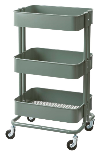 調味料や工具の収納にちょうどよい大きさの、コンパクトなキャスター付きスチール製ワゴン。シェルフに深さがあり、収納力もバッチリ。中段のシェルフの位置とキャスターの高さは自由に調整可能です。
