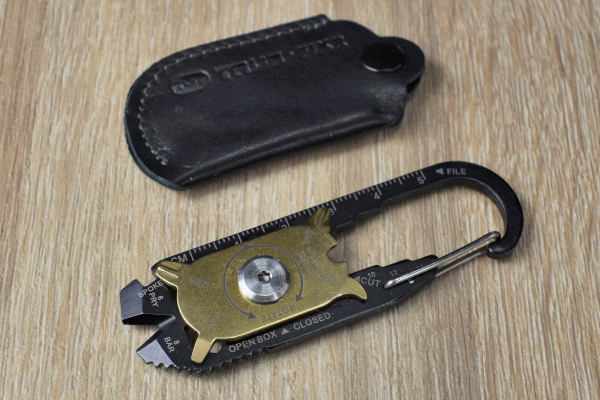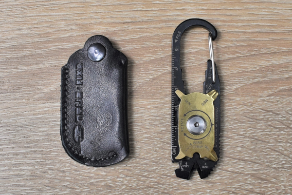 マルチツールには突起や鋭利な部分がいくつかありますが、保護するための専用レザーケース付きなので安心。持ち歩きの際に手や服を傷つけるリスクを予防できます。カラビナ部分はケースに入れたままでも使えるので、鞄やベルトループに引っ掛けておけますね。