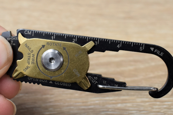 中央の金メッキは回転する仕組みで、90度回転させると下から6mmレンチと8mmレンチの穴が。金メッキ部分の角度を調節することで、ドライバーやネイルクリーナーも使いやすい状態になります。