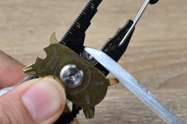 レンチの上には、紐やロープを切れるカッターも。試しにビニールテープを切ってみたところ、小さいながらも切れ味は抜群です。