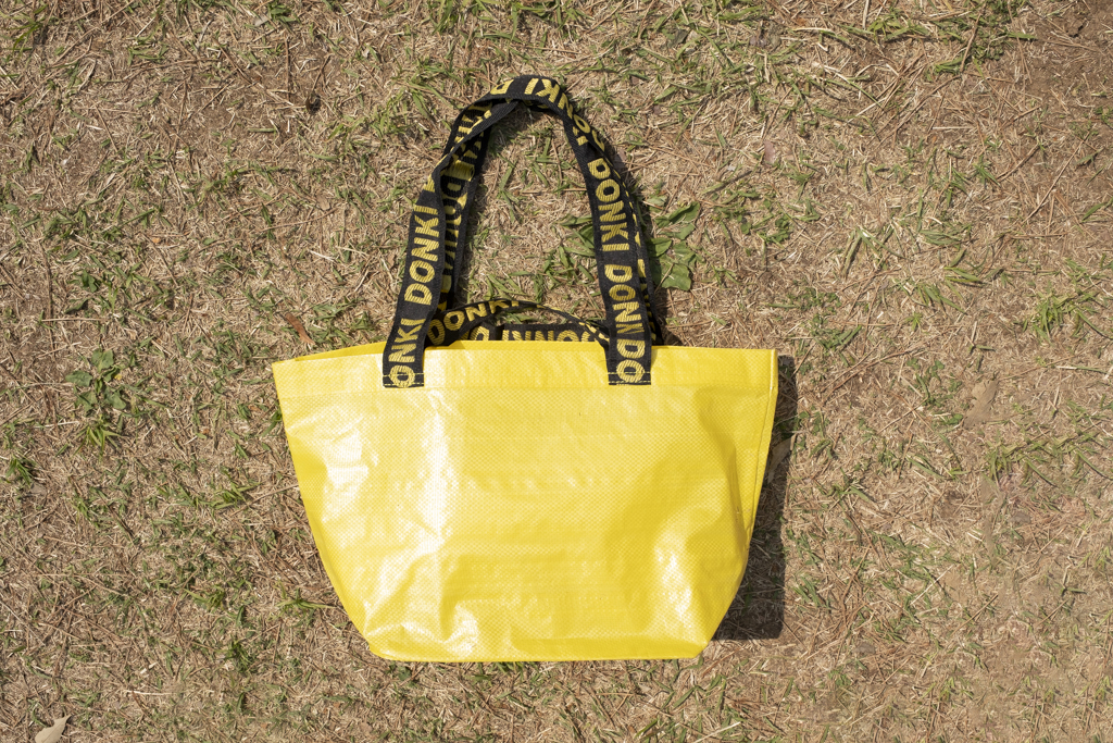 「IKEA」の店内用のキャリーバッグのようにも見えますが、その持ち手には黒と黄色で「DONKI」の文字。耐久性が高いので、あらゆる物を入れられますが、持ち歩いていると、知らない人からチラ見されることがあるかもしれません。インパクト重視には最適な逸品です。