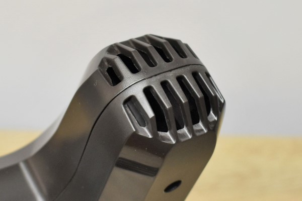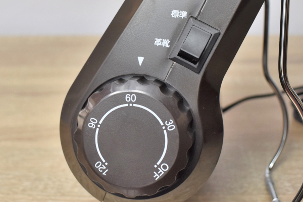 乾燥機本体は、15×9×22cmほどの大きさ。温風が出る2つの突起を、側面の切り替えスイッチやタイマー用のダイヤルで操作します。裏側には、立てておく時に便利な折りたたみ式のスタンドつき。さっそくスタンドを立ててコンセントを差してみました。切り替えスイッチは「標準」モードと「革靴」モードを使い分けるためのもので、スニーカーなら「標準」モードでOK。しっかり乾燥させるため、50~60分ほど乾燥させることにします。