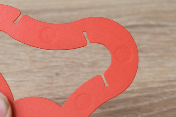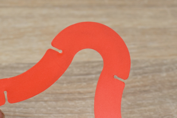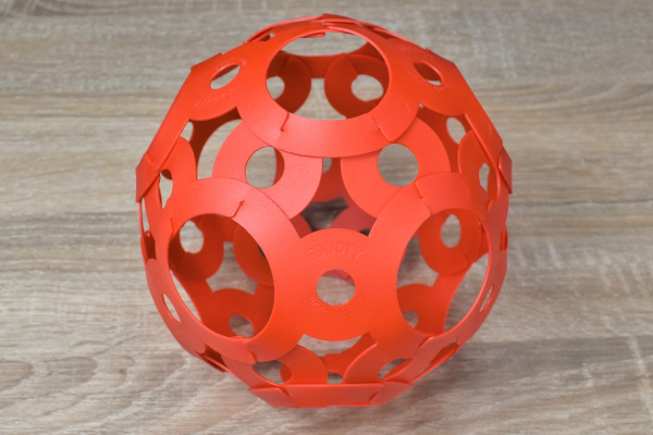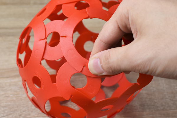 13.4(幅)×9.5cm(高さ)のプレートには四隅に切れ込みがあり、組み合わせることでボールに変わるという仕組み。内側の切れ込みと外側の切れ込みを交互に重ね、10枚を平らに繋げていきます。全部繋げたら両端のプレートも繋げ、円柱状に。そこから上下のパーツを閉じるように組み合わせれば、ボールの完成です。
