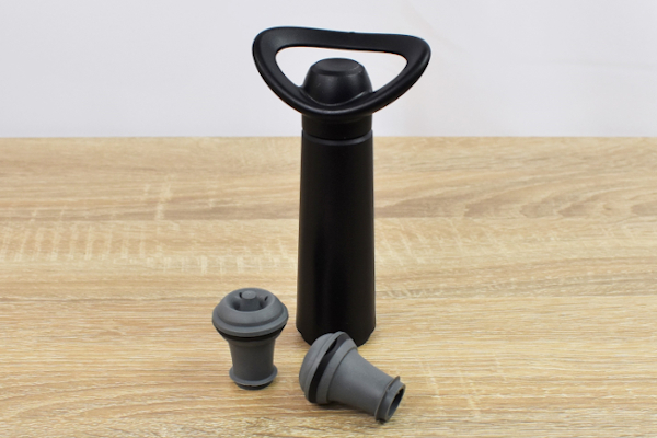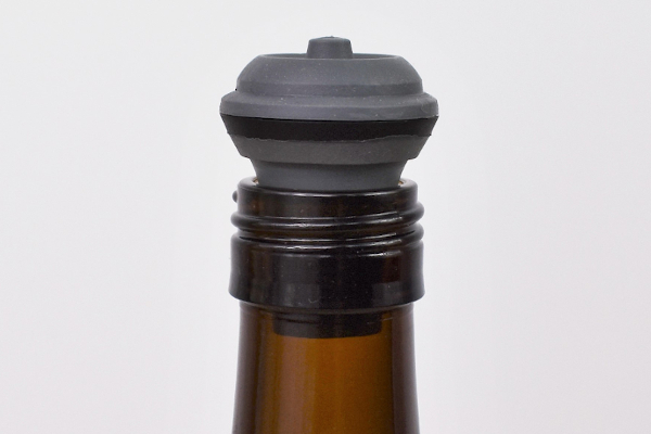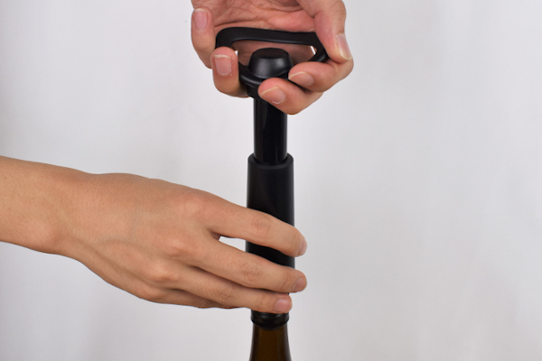 同商品は、瓶の中の空気を抜いてお酒の鮮度を保ってくれる“ポンプ”。瓶の栓代わりとなるストッパーと、空気を抜くためのポンプがセットになっています。まずはお酒の栓を抜き、代わりにストッパーをイン。奥まで入るよう、しっかりと押し込んでください。
