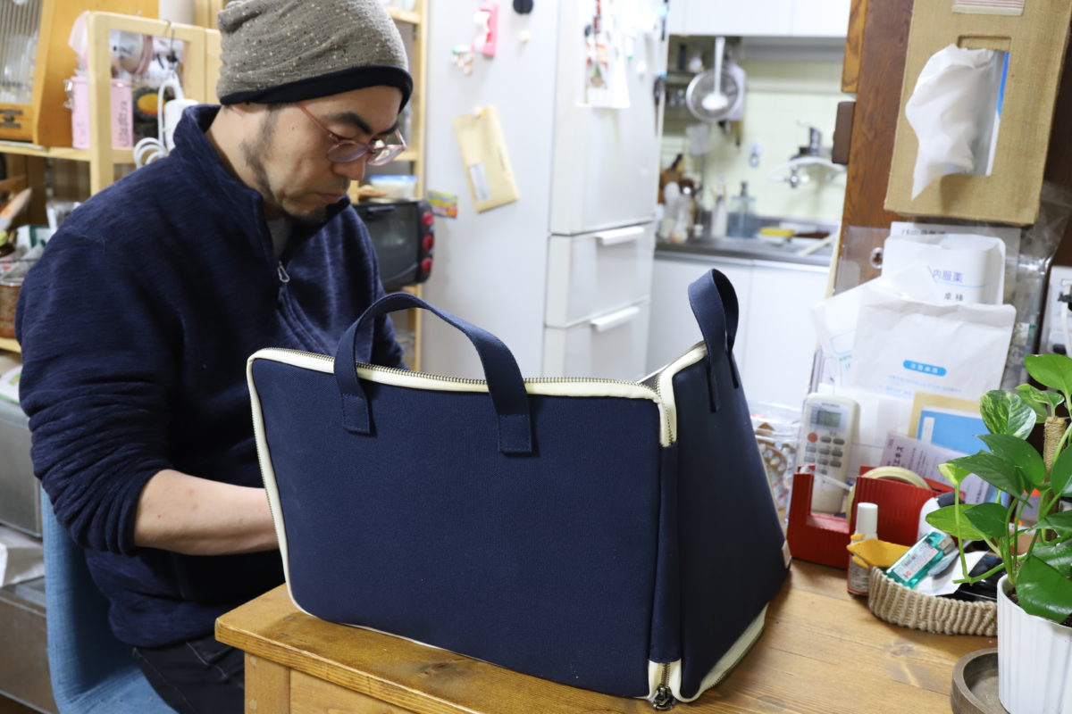 国産帆布製で、見た目は飾り気もなくシンプル。というか、いっそ素朴な印象だ。持ち手のハンドルも厚手で、がっちりした作り。頑丈だろうなとは思うが、この外見からは、なにか特殊な機能があるようには感じられないだろう。