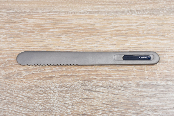 ザラザラの肌触りが特徴的な同商品。サイズは17.6cmほどですが、見た目よりも想像以上にずっしりしています。持ち手についている“THAT”のロゴがなんともクールで、一見バターナイフには見えません。使われている素材は、熱伝導率が高いとされる銅合金。手の熱がバターナイフに伝わり、固いバターが簡単に溶ける仕組みです。