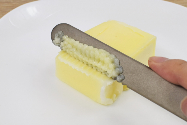 では実際にバターが溶けるのか実証開始。ナイフのギザギザ部分でバターに触れてみると、驚くほどあっさりと溶けてくれました。力を入れなくとも、ナイフが触れた箇所から徐々に溶け出していきます。これならトーストにもすぐ塗れてストレスを感じずに済みますね。