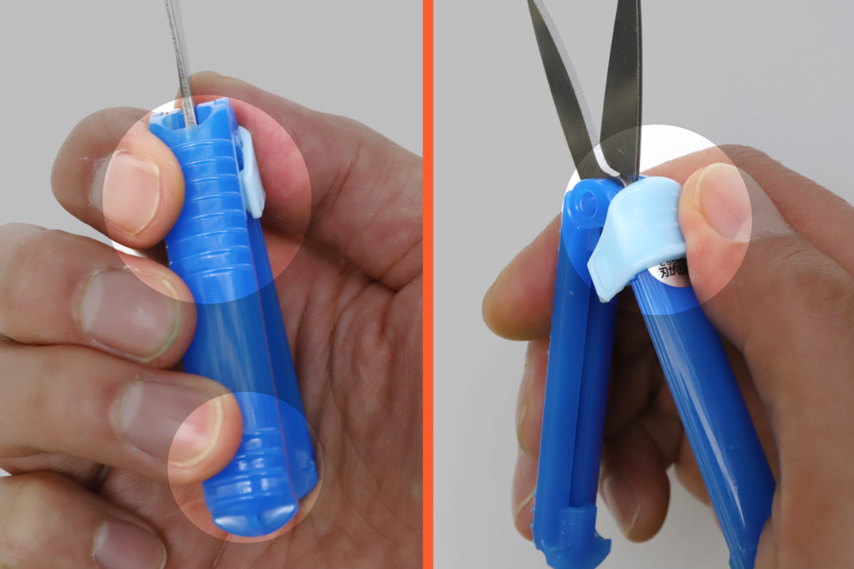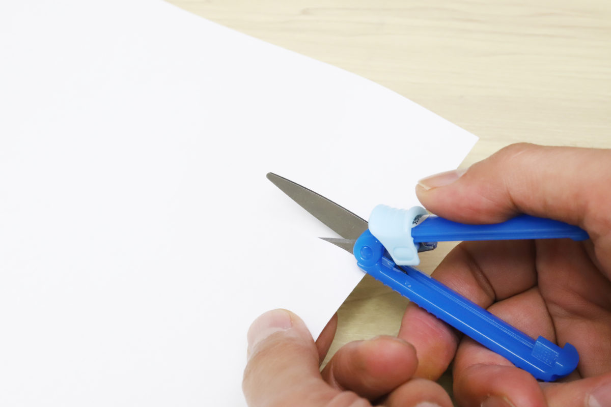 ストラップ付きのキャップから抜いた時点で、バネがフリーになってチョキチョキと切れる仕様で、安全ロックなどはなし。最近のキャップ付きペン型ハサミでは、ほぼ標準仕様とも言えるロック機構がないのは不安かもしれないが、そもそも刃がかなり短いので、さほど怖さも感じないはずだ。