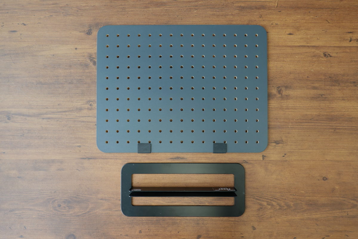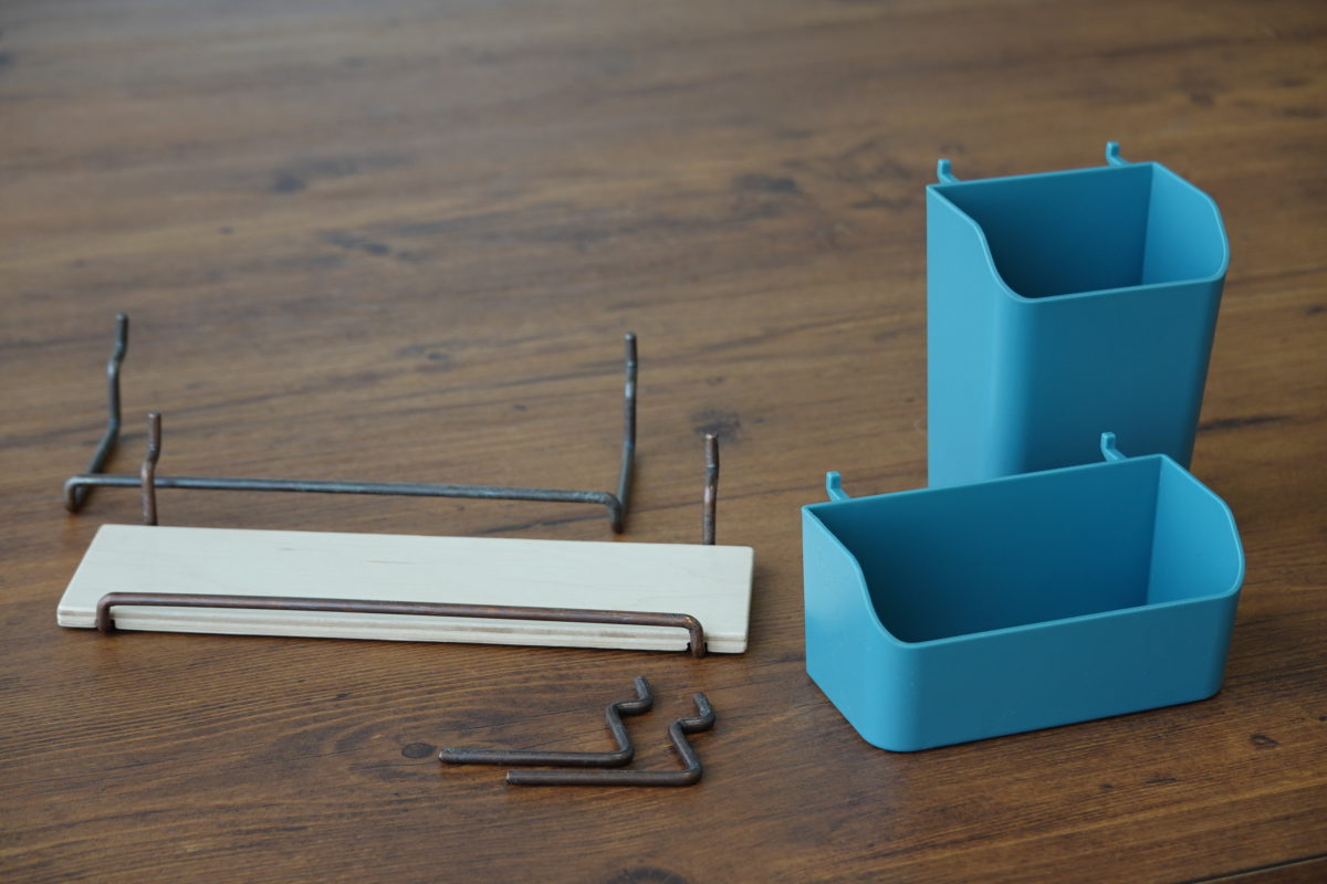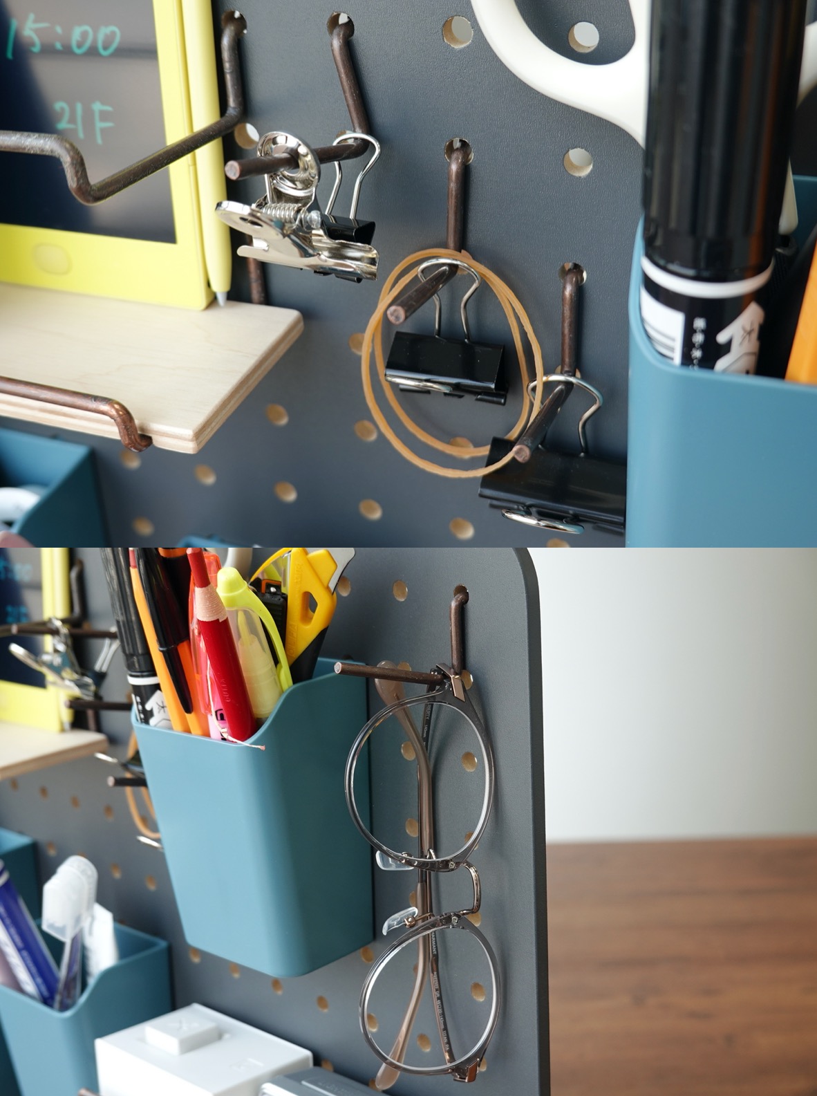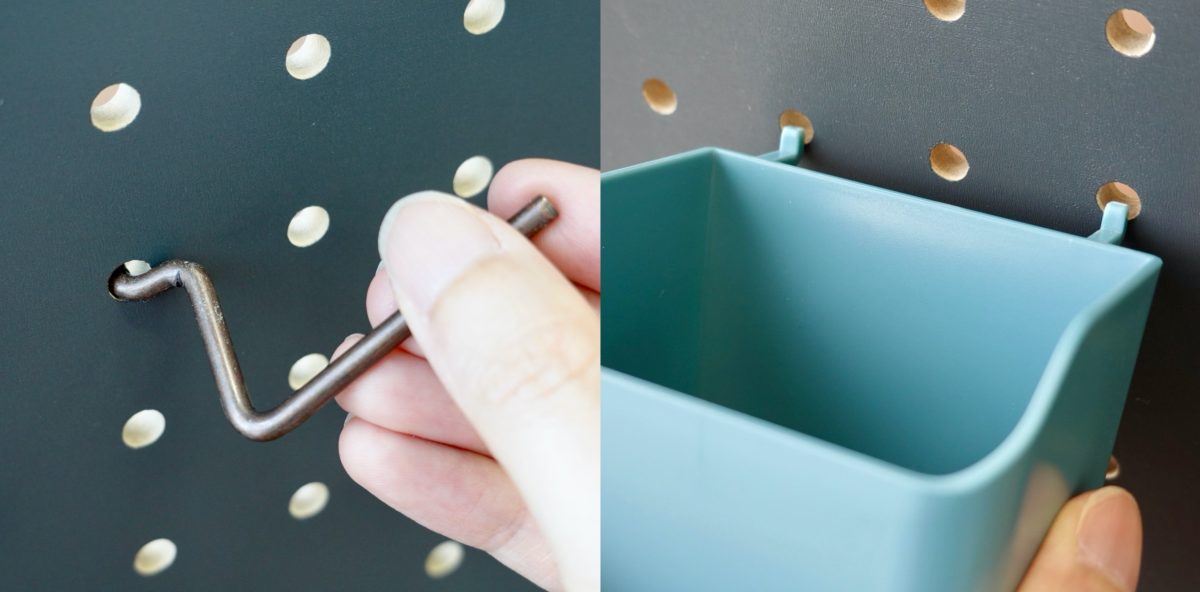 ちなみに、ペグボードは穴が裏側に通貫しているので、位置をうまくずらせば両側に収納を作ることも。