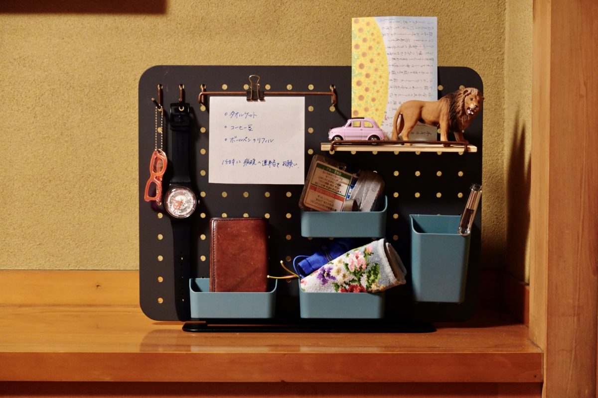 出がけに目につきやすく、帰宅後はひと息つく前にモノを戻せる、靴箱の上に設置。鍵や腕時計のほか、パスケースや、洗濯に出して忘れがちなタオルやマスクなど、外出時は必ず携帯したいアイテムに、それぞれ“居場所”を与えます。オプションパーツを有効に使って「定位置を決めること」で、ひと目見て持ち物の紛失や置き忘れを可視化できるのです。