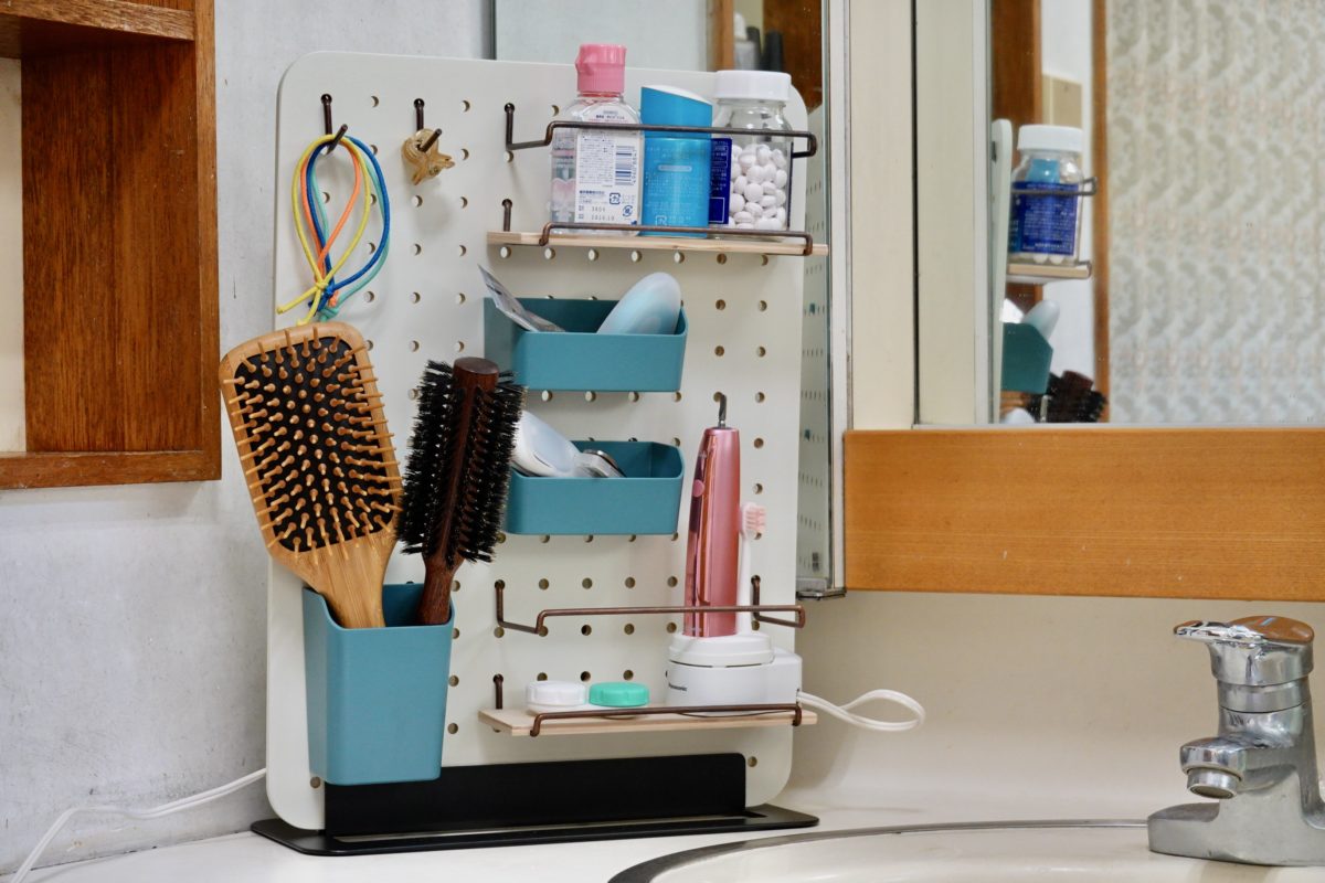 ペグボードは、チャコールブラックとオフホワイトの2色がラインナップするので、白が基調となった洗面台には明るいオフホワイトをチョイス。洗面ボウルのサイドは狭いので、縦置きで設置しました。