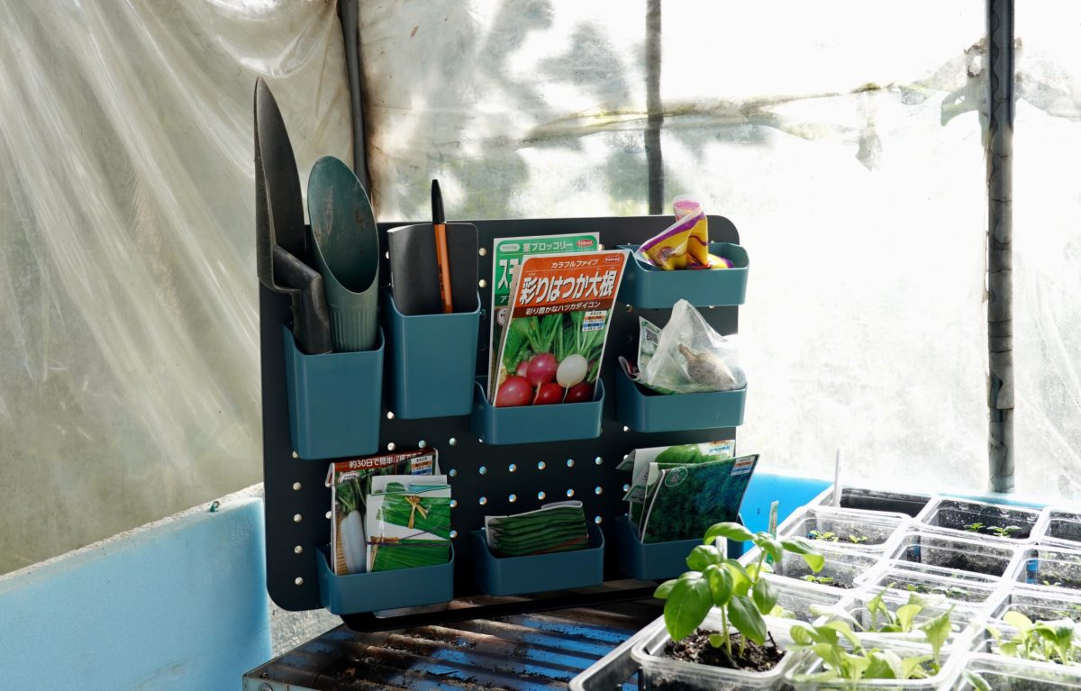 スタンドはそれなりに重量感がありますが、ペグボードが軽く、トータルで約1.2kgなので移動も簡単。そこで、家庭菜園に「ペギー」を持ち込んでみました。中身を見せながらたっぷり詰め込める「ミニコンテナ」に、種をストック。樹脂製のコンテナは、土などが付着してもすぐに洗い流せるので、汚れを気にせずに使えます。