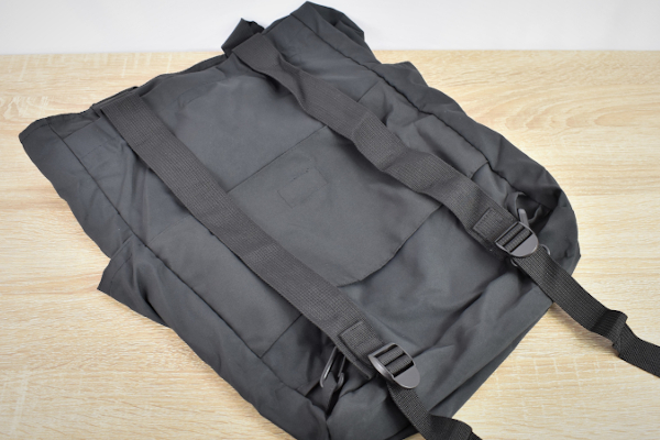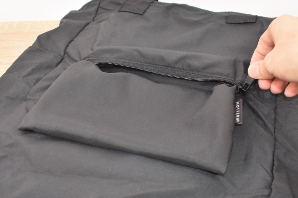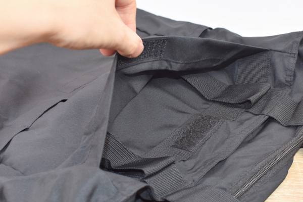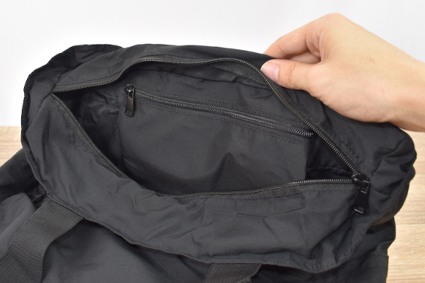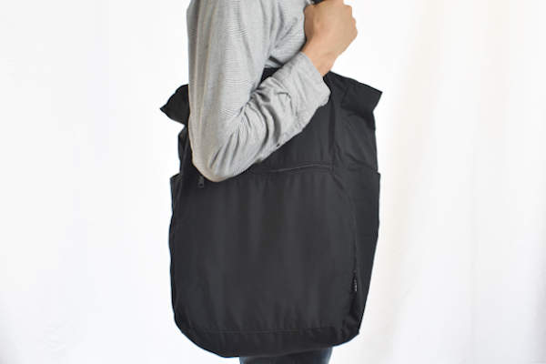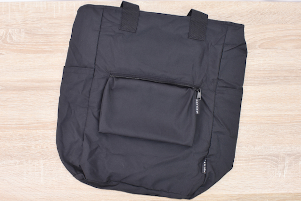 広げてみると、300(幅)×150(奥行)×420mm(高さ)のバッグに早変わり。表にはチャックつきのポケットがあり、両サイドにもオープンポケットがついています。さらに、バッグの中にもチャックつきポケットがついて収納はバッチリ。